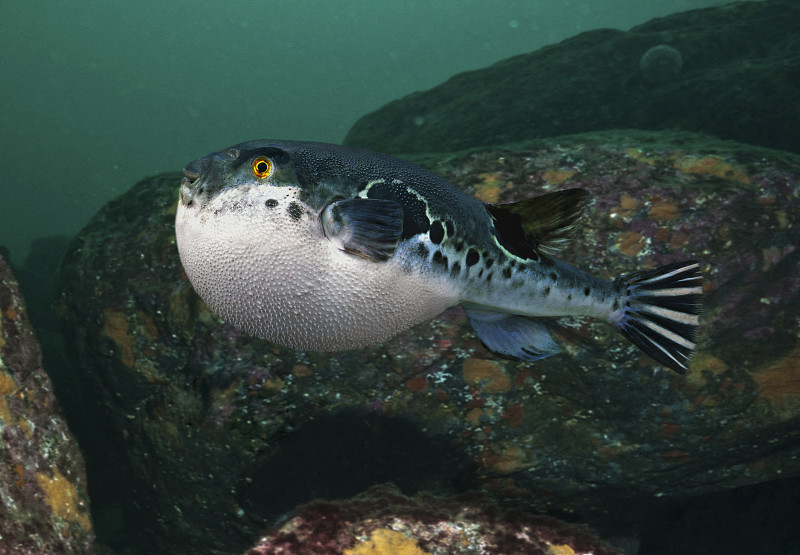 河豚:本称河鲀,别名艇巴、腊头等,泛指硬骨鱼纲鲀形目鲀科的各属鱼类。其肉味鲜美、营养丰富,是一种名贵的高档水产品,被誉为“菜肴之冠”,但其卵巢、肝脏、肾脏、眼睛、血液中含有剧毒,处理不当或误食,轻者中毒,重者危及生命。少数种类生殖季节溯河进入江河产卵,如暗纹东方鲀可沿长江上溯至洞庭湖产卵,也可在长江及通江湖泊中定居,是我国重要的鱼类资源,主要生活在水的中层或底层。