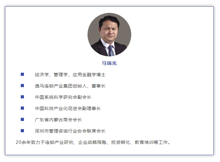 马瑞光博士,作为经济学、管理学、应用金融学领域的杰出学者,同时也是逸马连锁产业集团的创始人和连锁行业的领军人物,他深耕连锁产业二十余年,以敏锐的洞察力和前瞻性的思维,不断推动行业进步。至今,马瑞光博士已主持编写出版了包括《无限连锁》、《全网连锁》、《世界是连锁的》等在内的30余本专业书籍与大学教材,为连锁产业贡献了宝贵的智慧与经验。