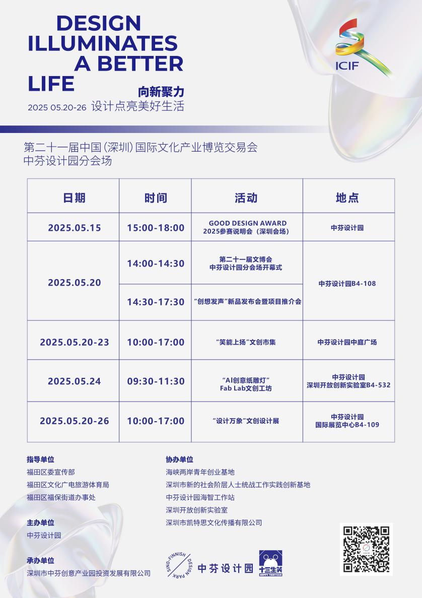 作为分会场之一,第二十一届文博会中芬设计园分会场将于2025年5月20日—26日在深圳福田保税区中芬设计园举办。活动由福田区委宣传部、福田区文化广电旅游体育局、福田区福保街道办事处指导,中芬设计园主办,深圳市中芬创意产业园投资发展有限公司承办,海峡两岸青年创业基地、深圳市新的社会阶层人士统战工作实践创新基地、中芬设计园海智工作站、深圳开放创新实验室、深圳市凯特思文化传播有限公司协办,以“向新聚力· 设计点亮美好生活”为主题,开展GOOD DESIGN AWARD 2025 参赛说明会(深圳会场)、分会场开幕式、一带一路低空经济工业设计创新中心揭牌、新品发布会、项目推介会、文创市集、Fab Lab文创工坊、文创设计展等一系列文化创意交流活动,以创新设计连接传统与未来,展现设计如何以美好生活为核心目标,为多元社会需求提供创造性的解决方案。