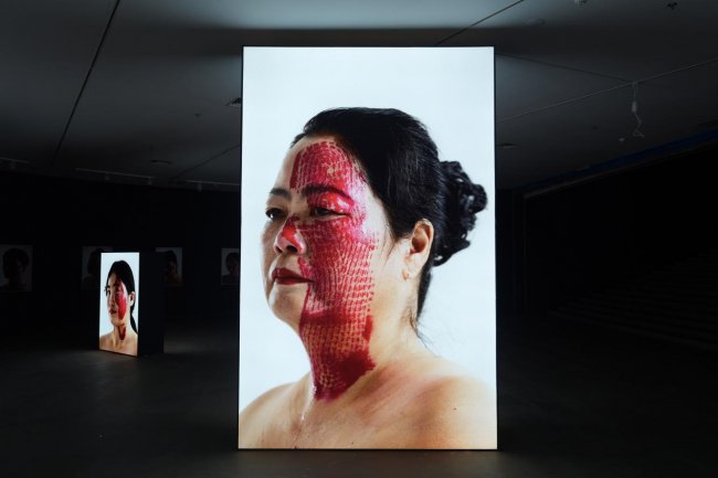 在最终呈现的肖像中,不同鞋印构成了一部微型的人际关系史。“每一张脸庞,都是承载关系的画布;每一个红印,都是情感、权力或记忆的实体烙印。”杨烨炘如此阐释。父母之印或许隐喻着家庭期待的压力,上司之印可能指向职场等级的压迫,而恋人、朋友或网络关系留下的痕迹,则让人联想到情感与社交结构中的摩擦与失衡。……这些鞋印,不仅留在皮肤上,更指向那些无形中塑造我们、伤害我们或定义我们的关系结构。
