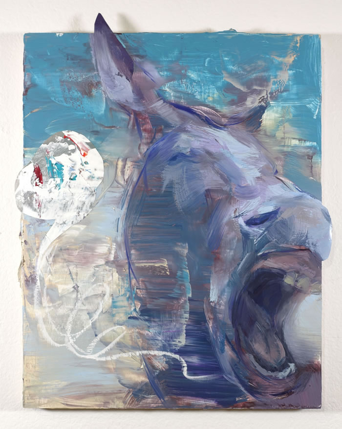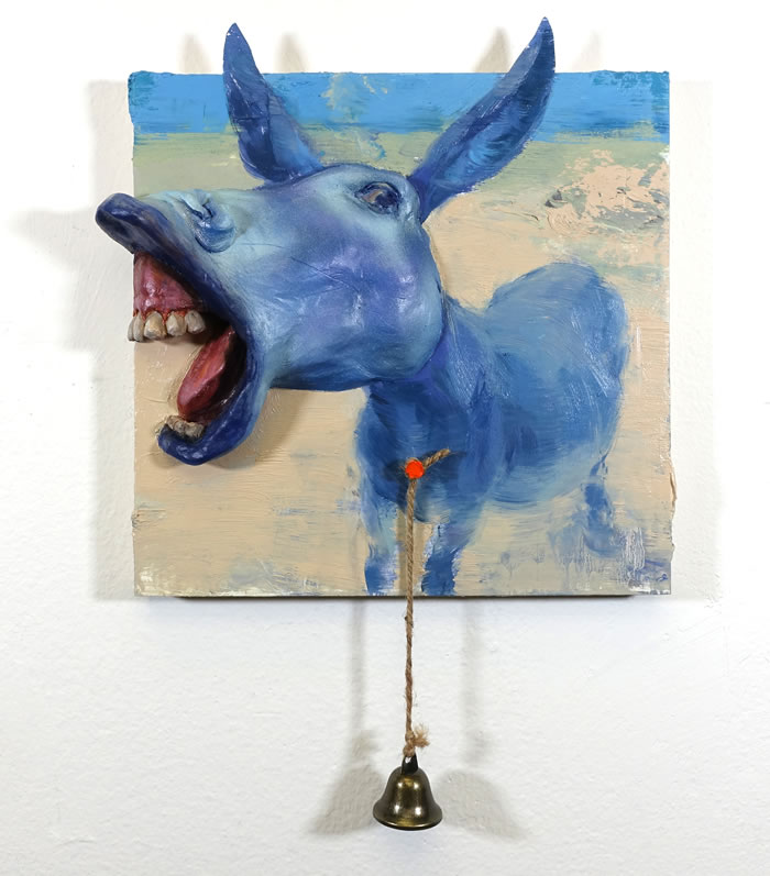 第一次看到龚若愚的画,就被他画面上迸发出的情绪牢牢抓住。那是他2024年底的一系列作品,蓝驴的形象以不同形态出现在画面中,有的脖子上坠着铃铛、有的双眼蒙上眼罩,作品特意突破画框边界进行了雕塑和综合材料的拓展,更加剧了整体的视觉冲击感,似乎隔着屏幕都能听见驴子的嘶吼声。
