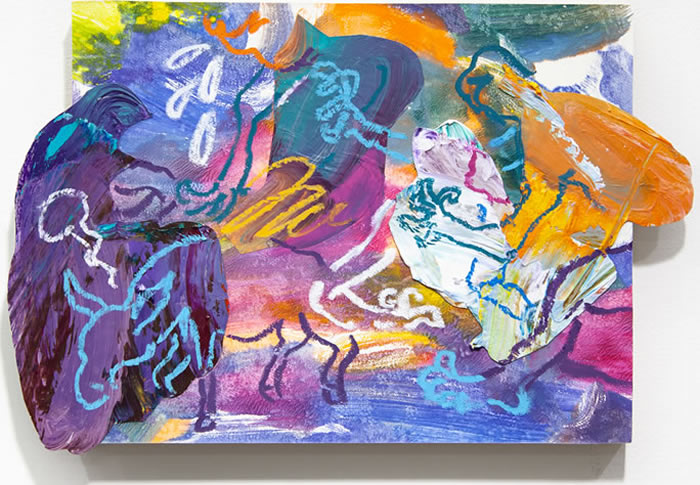 无疑,若愚笔下的驴是具有象征意味的。而他近期在纽约A Space Gallery举办的最新个展“笑点之下”(Beneath the Punchline)则让人看到在不到一年的时间里这位青年艺术家的探索和蜕变。在具象与抽象,视觉与语言的转译之中,他的作品更加成熟而松弛,更重要的是,随着形象的隐匿,潜意识浮现并得以于伸张真实的自我,让我们聆听到“笑点之下”,一位游走于中美艺术教育背景下的青年艺术家的困境、挣扎、黑色幽默中的自嘲,与笃信当下的执着。