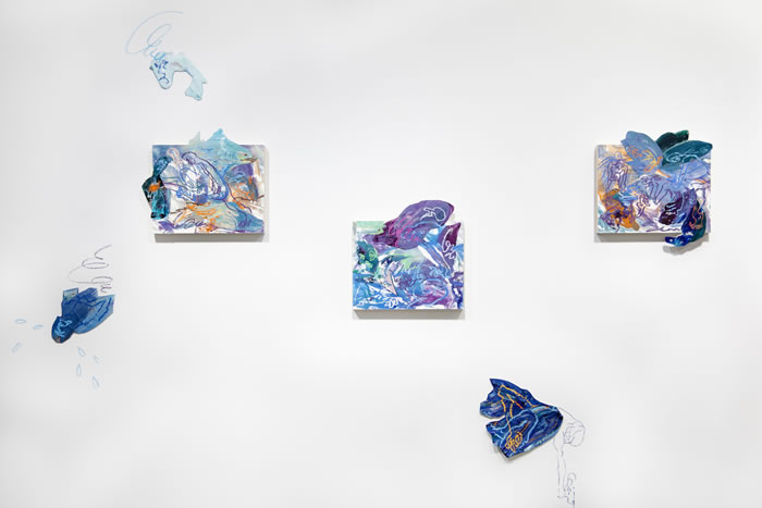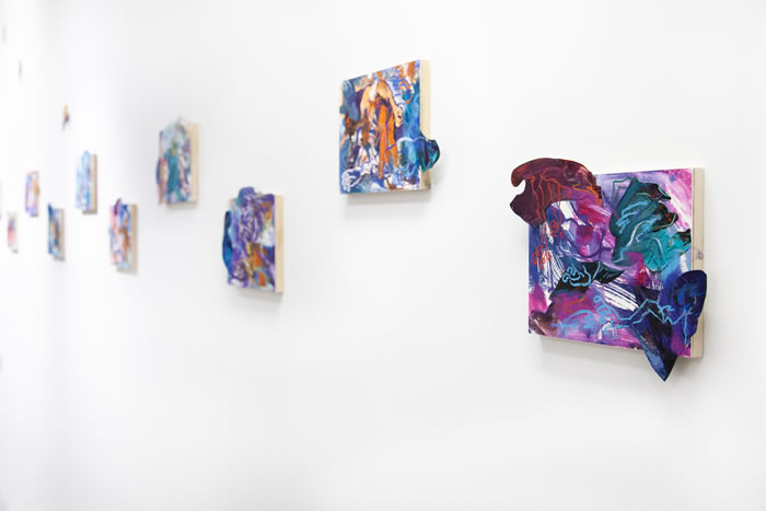 除此之外,他还通过拼贴元素进一步打破作品的边界:调色盘残骸被剪裁为不规则形状,转印复刻的亚克力版在肢解后被嵌入画面……龚若愚形容自己的创作为一种冥想与内观:“脑海中的场景就如同拼贴一样从来不是规则的,它的形状正契合了我的情绪边界。”