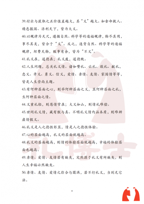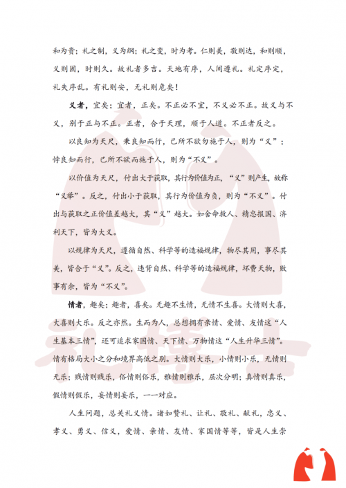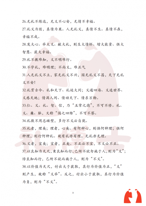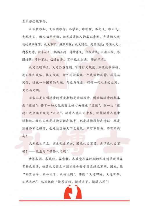 礼义,是定人伦、辨是非、决嫌疑、和家邦、安天下的人文根本,是道德的重要基石与重要体现。人无礼义不立,家无礼义不兴,国无礼义不昌,世界无礼义不安。任何民族的文化文明和精神品格,皆离不开礼义。