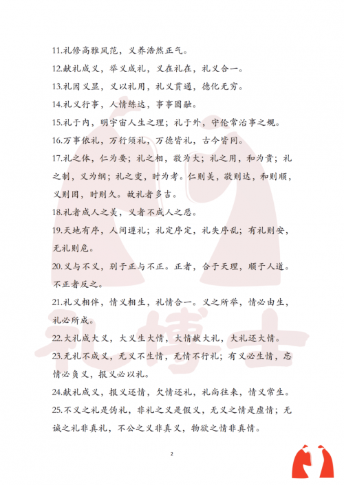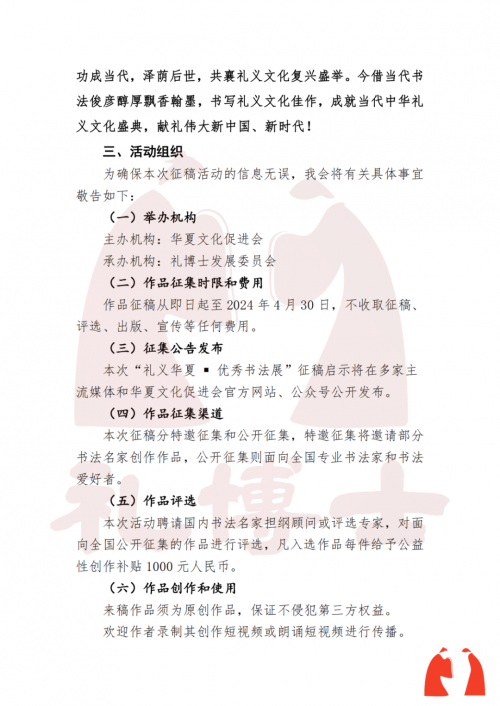 所有作品皆须围绕“礼义”展开创作,诠释礼义文化内涵精神。由礼博士发展委员会提供部分礼义文化短语、文章做参照,并保证无知识产权纠纷。创作者皆可原文采用或自行创作。(补充说明:礼博士发展委员会公众号刊有十几万字礼义文化创研成果和素材,自本启示发布之日起,创作者可自行查阅参考)