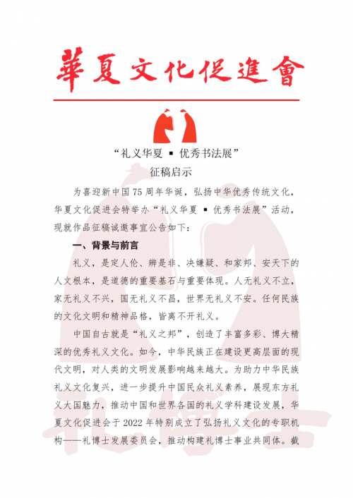 为喜迎新中国75周年华诞,弘扬中华优秀传统文化,华夏文化促进会特举办“礼义华夏■优秀书法展”活动,现就作品征稿诚邀事宜公告如下: