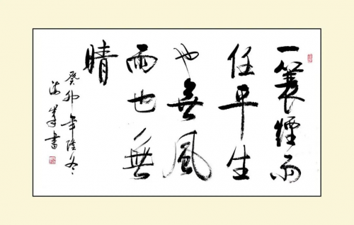 《行万里路读万卷书》、《不忘初心》、《携手构建合作共赢新伙伴同心打造人类命运同体》及几首唐诗作品,创作立意高,其用笔中锋铺毫,逆入平出,藏锋一致,非真非草。细看稼纤间出,离方遁圆,筋力老健,风骨洒脱,墨纵有余,肥瘠相称,章法布局笔触、间白风格和谐,用书法讲述中国故事。