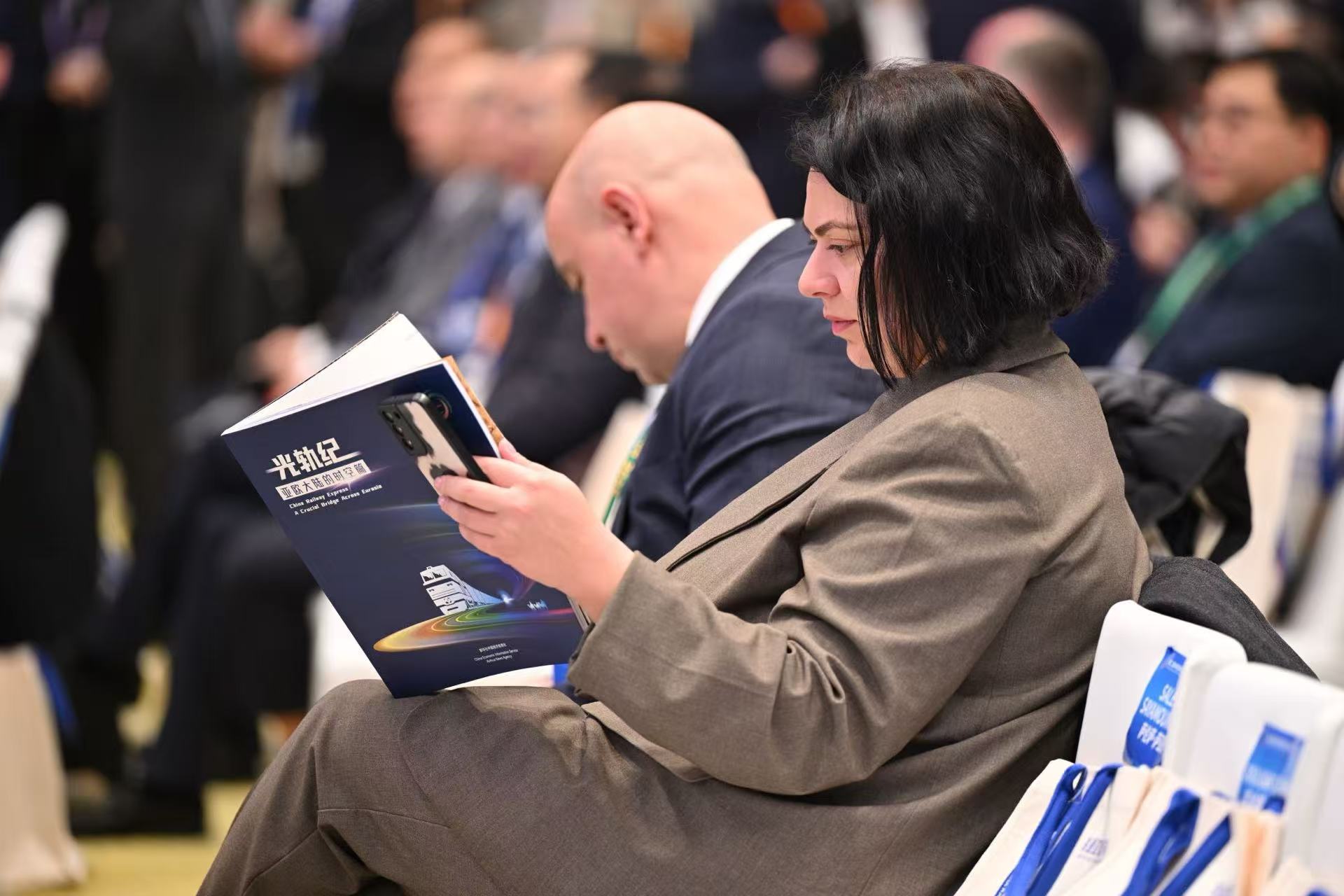 11月18日,在第二届中欧班列国际合作论坛上,与会嘉宾在翻阅《光轨纪——亚欧大陆的时空篇》案例集。主办方供图。